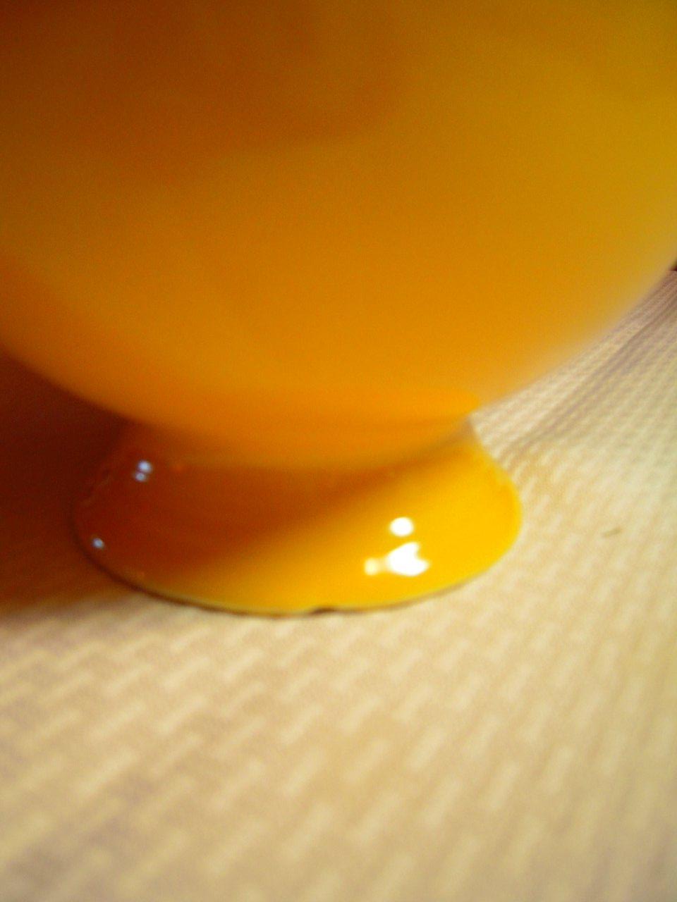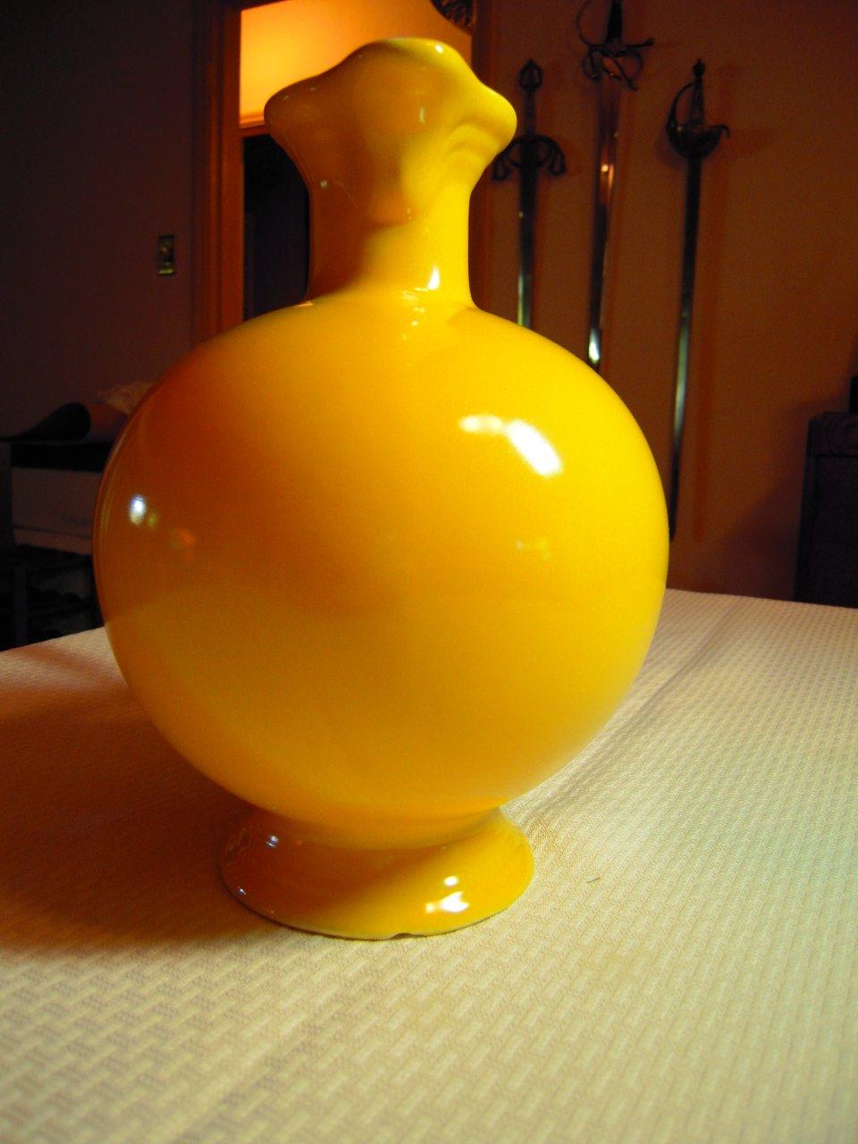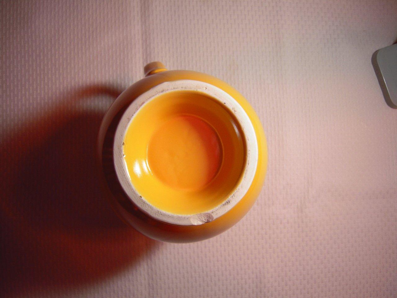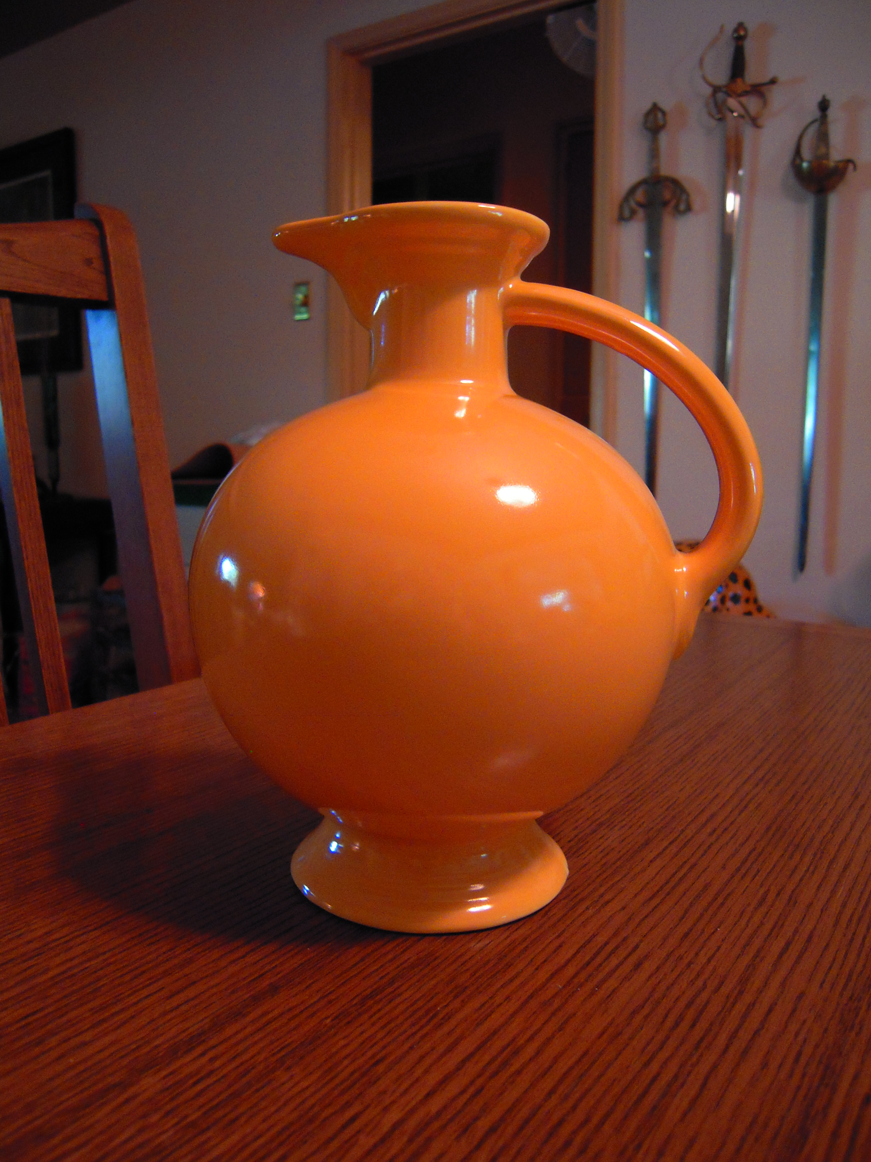 This piece is missing its lid and has a small chip on the bottom rim. The chip is slightly visible when the carafe is sitting upright.